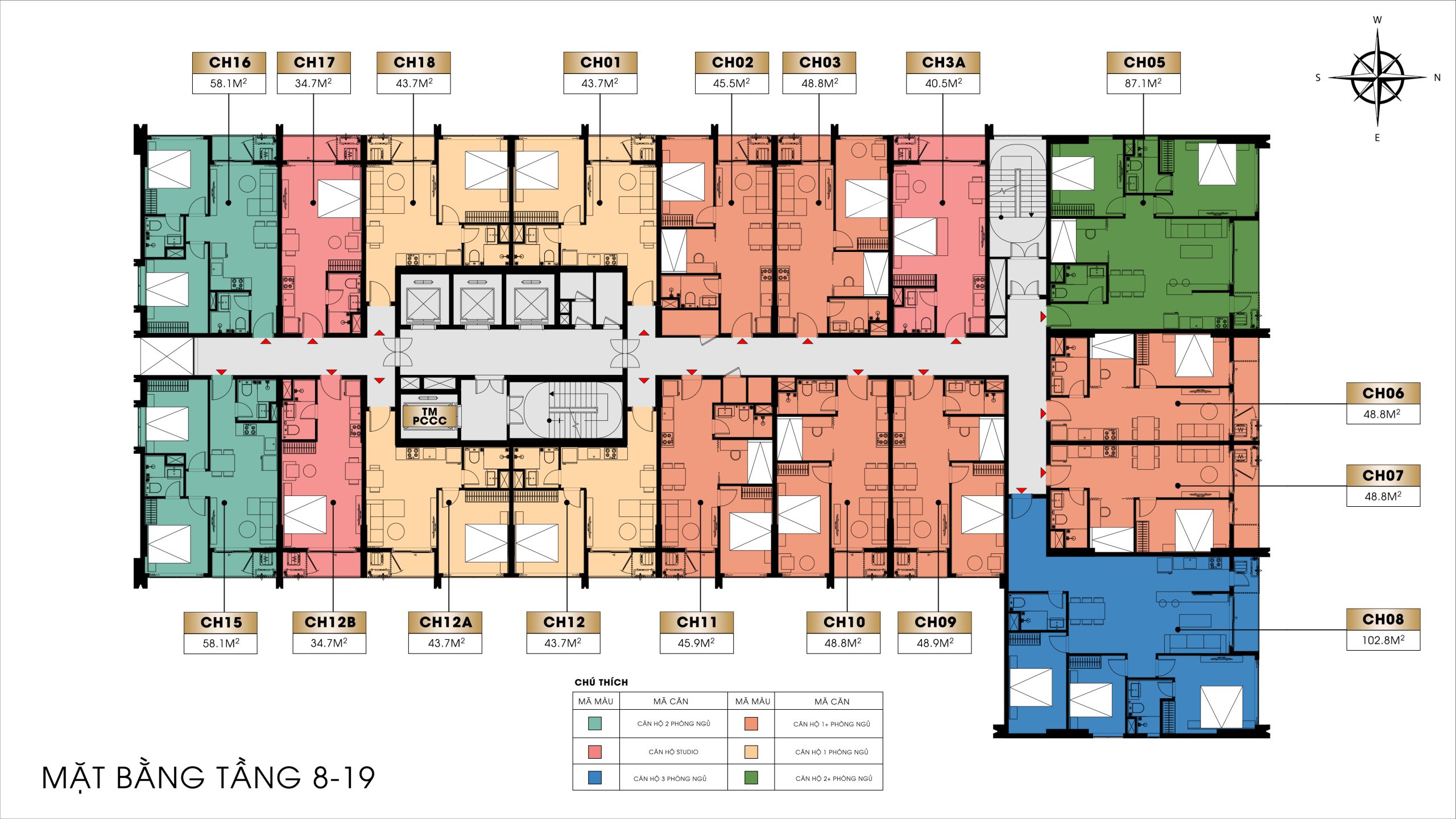 - Với căn Studio diện tích (34,7m2 – 40m2), 1PN diện tích (43m2 – 45m2 – 48m2), 2PN diện tích (58m2) và 3PN với diện tích (87m2-102m2).